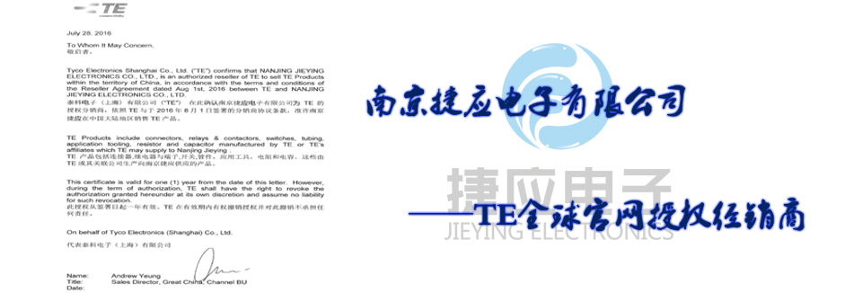 南京捷應電子有限公司是國際無源器件品牌美國泰科電子(TE)在中國華東地區(qū)的主要通路商,代理經(jīng)銷旗下全系列產(chǎn)品包括TYCO(AMP)系列連接器、接插件、OEG、SCHRACK、P&B功率繼電器、美國RACHEM各類航空導線、熱縮套管、?s套、標識產(chǎn)品、電線電纜。